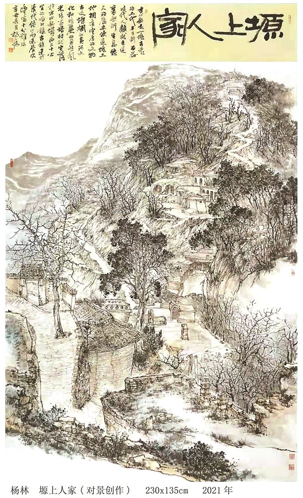 又從山腳通過數(shù)條彎曲的山路,將視線逐漸地引向山頂,中間又穿插數(shù)組民居窯洞,便使畫面豐富而有了層次,作品構(gòu)圖頂天立地,采用滿構(gòu)圖,整體觀之視線由近處的路,向下逐漸抬升視線,直至山頂曲折而富有層次,充分的表現(xiàn)了《塬上人家》的真實場景,這樣的場景和構(gòu)圖如果不在現(xiàn)場對景創(chuàng)作是很難找到感覺的,10個小時的不間斷畫畫,墨稿就基本完成,回來后稍加整理再著色最后完稿,尚有蒼茫渾厚,郁郁蔥蔥塬上人家的春天氣息。