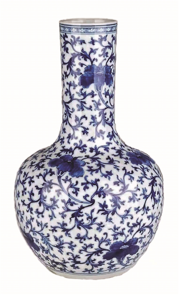天球瓶是受西亞文化影響極深的一種瓷器造型。天球瓶,歷代皇室貴族獨(dú)愛,象征著“千秋太平”的天球瓶,創(chuàng)燒于明代永樂、宣德年間的江西景德鎮(zhèn)窯,瓶形為小口、直頸、豐肩、假圈足,因圓球腹碩大,像是從天降下來似的,故名。