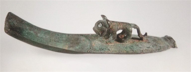 呂梁出土的兵器多為獸首形,鈴首的短劍飾管、銎斧飾管、銎戈飾管銎矛和軍事裝備的胄、靴形器,銅盔、青銅弓形器,具有草原風(fēng)格。其中桃花者出土的一件青銅虎飾匕,鑲嵌綠松石,匕首彎曲修長,匕身手柄部位裝飾一只寫實的大猛虎,大頭卷尾,身微后傾,一副準(zhǔn)備騰躍猛撲狀,動態(tài)十足?;⒀坭偳吨G松石,整個匕身為素面體。殘長18cm,寬4.6cm,1959年出土。制造工藝精細(xì)高超。
