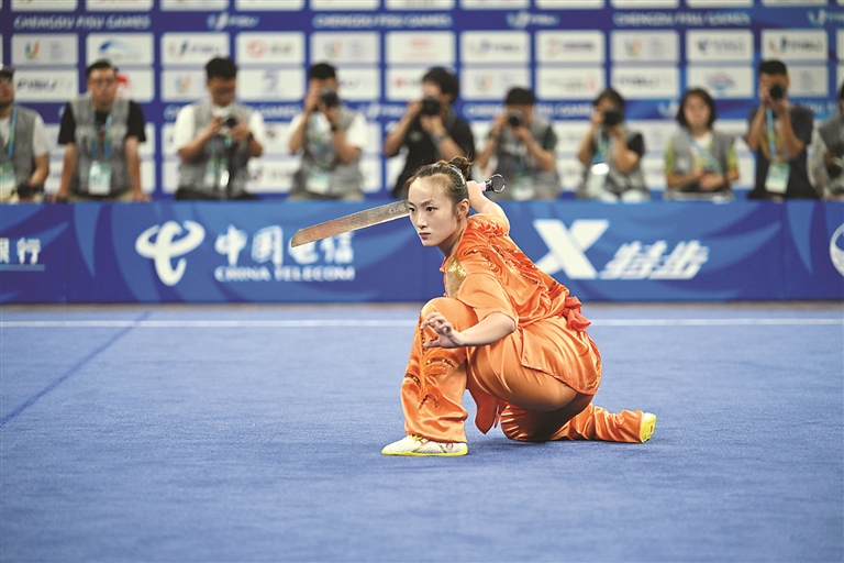 當(dāng)日,在成都舉行的第31屆世界大學(xué)生夏季運動會武術(shù)項目女子南刀比賽中,中國選手宋翠芳以9.666分的成績獲得冠軍。 新華社記者 蔡湘鑫 攝