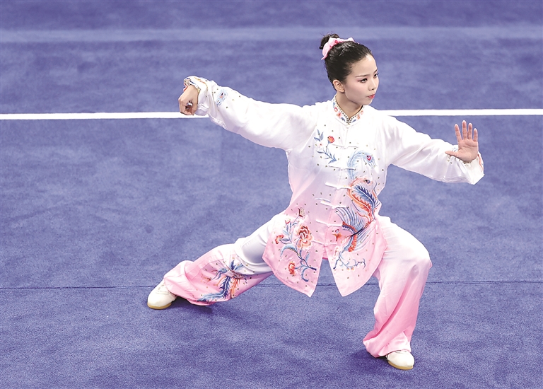當(dāng)日,在成都第31屆世界大學(xué)生夏季運動會武術(shù)女子太極拳比賽中,中國選手陳小麗以9.753分的成績奪得冠軍。 新華社記者 賈浩成 攝