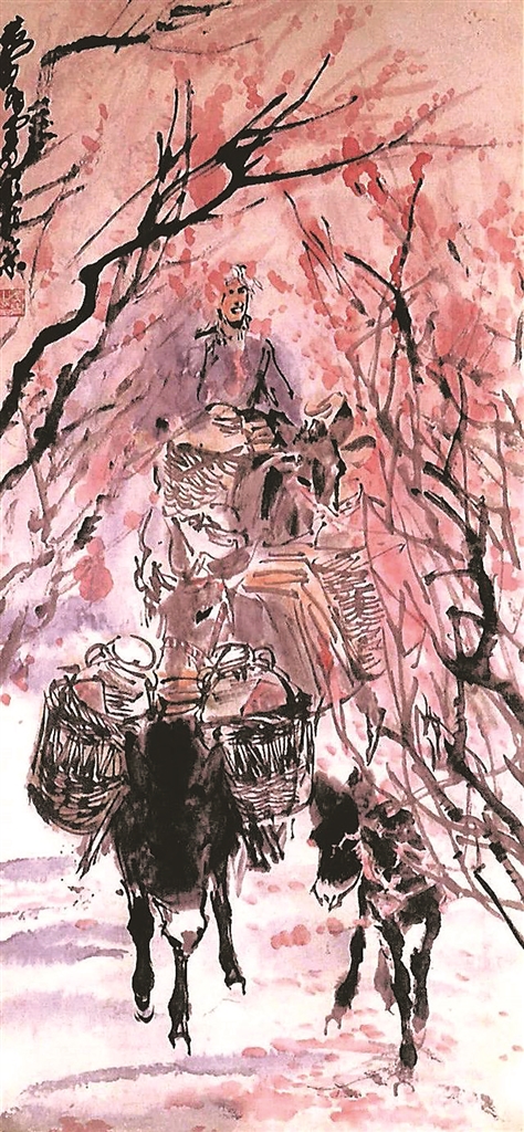 我沉思片刻,想到近年來(lái)到杏花村采風(fēng)、旅游、品美酒的畫(huà)家不少,大多以杏花、汾酒為題材寫(xiě)生作畫(huà)。大約70年代左右比較有名畫(huà)家之一是黃胄先生。汾酒博物館收藏有黃胄的一幅精心之作《馱酒圖》,題材來(lái)自于生活,對(duì)送酒工的寫(xiě)實(shí)畫(huà)。作品以騎驢的送酒工為畫(huà)眼,驢群馱著杏花村的美酒,穿過(guò)茂密的杏林。