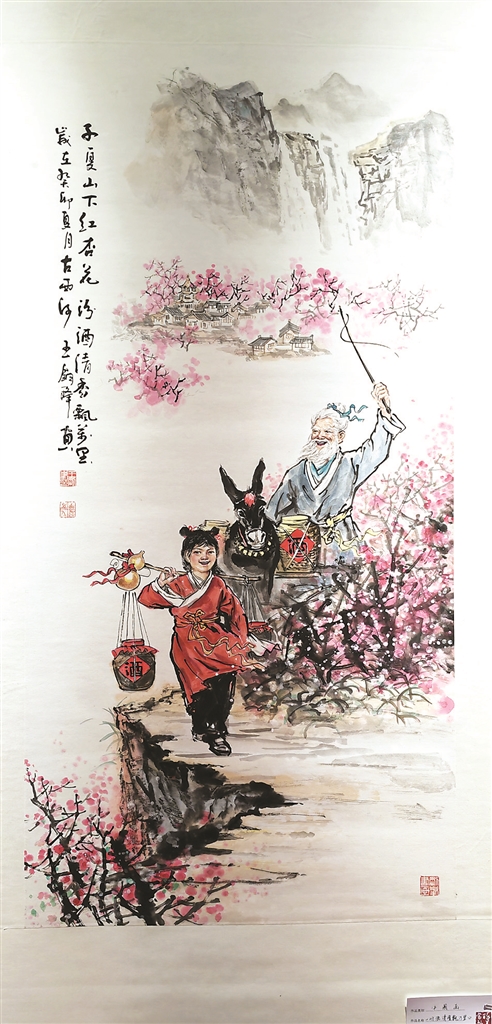我反復(fù)觀看畫(huà)作,只見(jiàn)畫(huà)面構(gòu)圖布局合理,遠(yuǎn)景、近景濃淡變化自然。主景人物老人、小孩面帶淺笑,平淡地放射著沽酒后發(fā)自?xún)?nèi)心的陽(yáng)光和歡喜,也有種從容、淡定、自信自足的氣息。老人紅潤(rùn)的臉色,胡須像銀絲一樣有光,一手揚(yáng)鞭,驅(qū)趕著毛驢快跑,小孫兒肩挑酒簍走在前面。配景杏花盛開(kāi)粉白相間,遠(yuǎn)處的酒家依稀可見(jiàn)。畫(huà)中題款“子夏山下紅杏花,汾酒清香飄萬(wàn)里”點(diǎn)出了畫(huà)的主題。