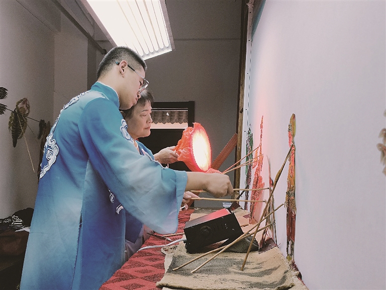 燈光漸暗、音樂響起,白色幕布上精巧別致的人、物圖像出現(xiàn)了,兩位幕后表演者的操作下,孫悟空、豬八戒、柳樹精、小鬼等角色粉墨登場,每個(gè)造型仿佛被賦予了生命,動作自如,上天入地、無所不能,神奇的光影世界妙趣橫生,惹得人們紛紛駐足觀看。