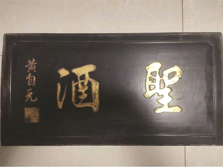 匾額一般掛在門上方、屋檐下,一般是比較顯眼的大門或正房,是建筑物的靈魂和眼睛,用來表達(dá)主人的喜好、義理、情感之類的文學(xué)形式。本文提到的“圣酒”,原先應(yīng)該是懸掛在門楣上方,也許是為釀酒作坊的東家所書或經(jīng)營白酒的商號(hào)題寫。