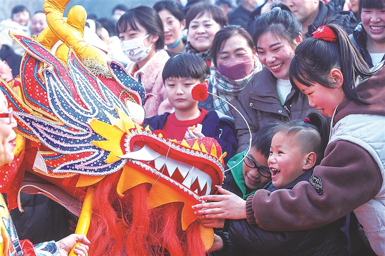 2月10日,在河南商丘古城春節(jié)民俗表演巡游活動上,游客與民間舞龍隊互動。