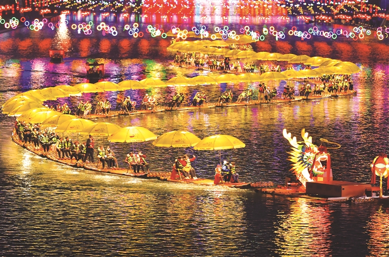 圖為2月11日,游客在湖北省恩施土家族苗族自治州宣恩縣城貢水河休閑賞夜景。 新華社發(fā)(宋文 攝)