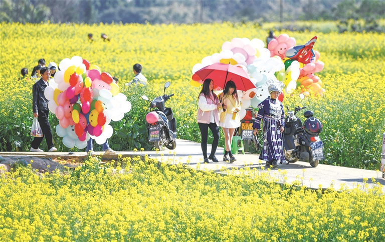 圖為2月17日,游客在貴州省興義市萬峰林景區(qū)的油菜花海中游玩。 新華社發(fā)(劉朝富 攝)