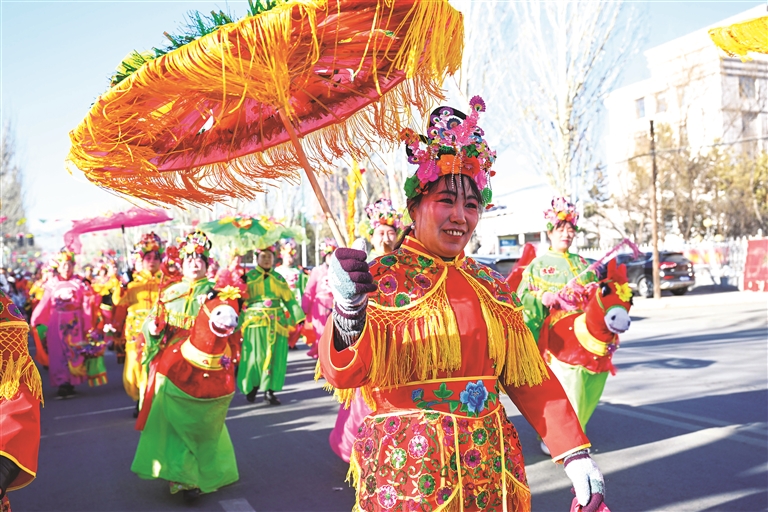 圖為2月17日,表演者在內(nèi)蒙古烏蘭察布市涼城縣街道上巡游演出。 新華社記者 劉磊 攝
