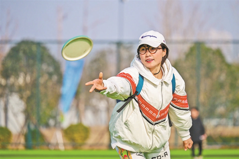 圖⑤河南洛陽,市民體驗(yàn)飛盤運(yùn)動。