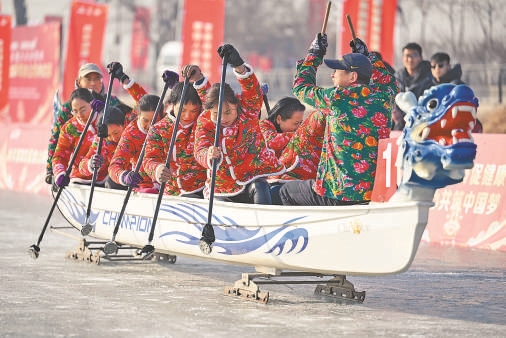 圖④寧夏銀川,市民參加冰上龍舟競賽。