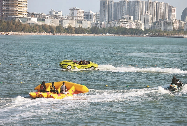 圖⑧海南三亞,游客在海月廣場附近海域體驗(yàn)海上運(yùn)動項(xiàng)目。