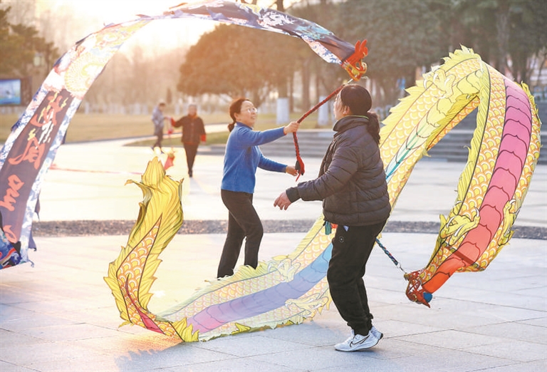 圖①江蘇淮安,市民舞彩帶龍健身。