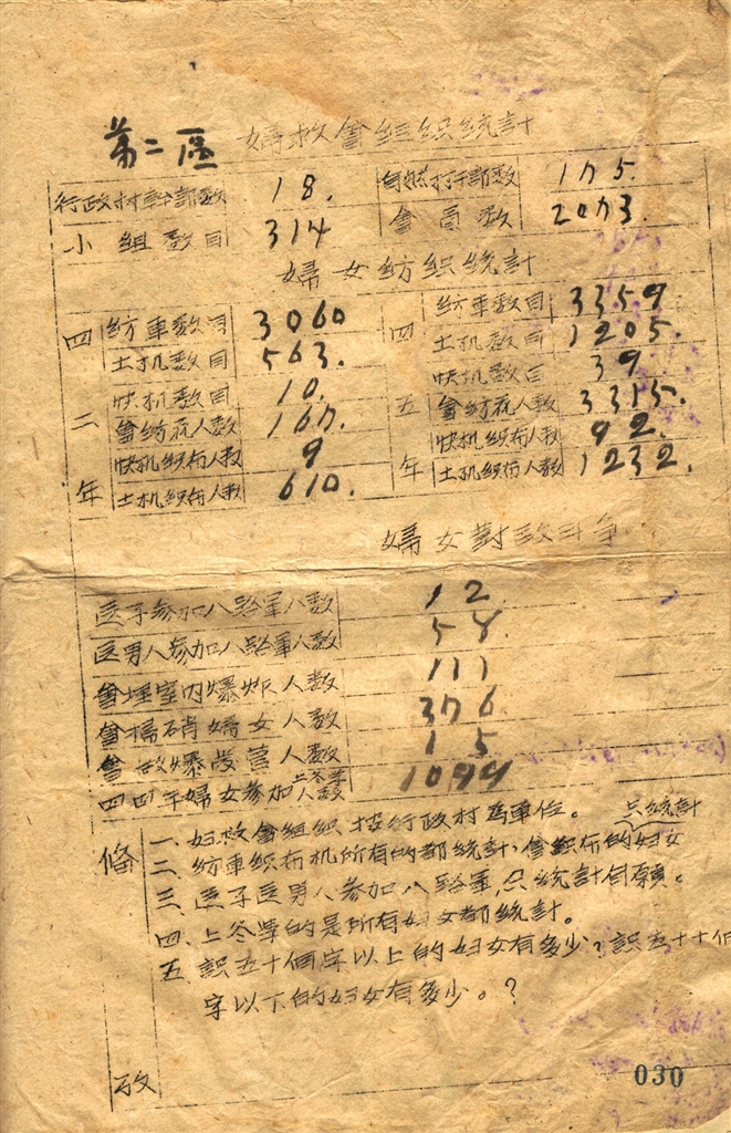 這些印在泛黃宣紙上的阿拉伯?dāng)?shù)字,實(shí)則是千萬根棉線擰成的力量圖譜。當(dāng)“正月忌針線”的舊俗還在黃土高原窯洞間徘徊時,婦救會統(tǒng)計(jì)表已用數(shù)字的銳度,劃破了封建思想的凍土。
