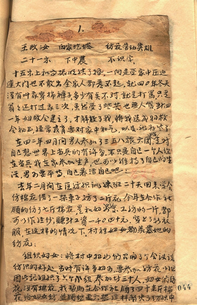 王改汝,白家圪垯紡花勞動英雄,二十一歲,中下農(nóng),不識字。十五歲上和高振明結(jié)了婚,一向是受家中壓迫,連大門也不敢出,全家人都看不起。到四一年婦救會建立了,才解放了我,將我選成婦救會秘書。在四二年四月間,男人參加了三五八旅六團(tuán),臨走時自己想,你在外當(dāng)兵,我在家參加生產(chǎn),也可以維持了自己的生活,男女要平等,自己養(yǎng)活自己吧!將村中婦女們召開了個會議,說紡織的好處,當(dāng)時有許多婦女,要參加紡花小組,因此就組織了六個小組,參加者三十人。婦女們紡花沒有棉花,我?guī)椭诤献魃珙I(lǐng)了四十來斤棉花給婦女紡,并領(lǐng)紡車六架,這樣解決了紡織中的困難。而三十個婦女都學(xué)會了紡花,后來紡花情緒很高,自己到合作社買車子六架,紡花幫助解決家中生活問題。