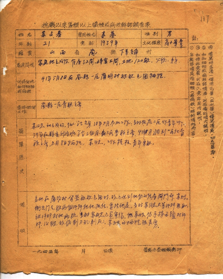 嵐縣檔案館館藏的《抗戰(zhàn)以來(lái)區(qū)級(jí)以上犧牲或病故干部調(diào)查表》,檔號(hào)為024-1·1·1-11的檔案中記載了烈士蘇占基的事跡。寥寥數(shù)語(yǔ),如刀刻斧鑿,簡(jiǎn)練卻厚重地勾勒出他短暫而熾熱的一生。