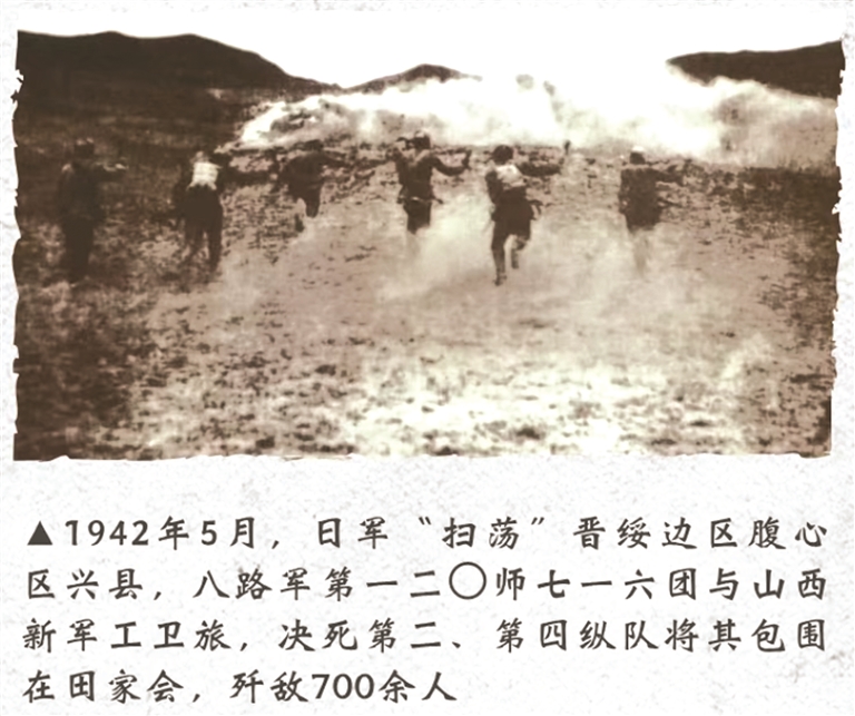田家會戰(zhàn)斗是1942年晉西北反“掃蕩”中以少勝多的光輝戰(zhàn)例。5月中旬,日偽軍700余人奔襲晉西北軍區(qū)機關(guān)。14日,日軍沿嵐興公路急進,遭八路軍在吳家溝、雜石溝阻擊,2名偽軍被俘。日軍15日拂曉隱蔽于李家莊密林,晉西北軍區(qū)部署部隊監(jiān)視待機,嚴陣以待。16日,日軍試探出擾被擊退,當(dāng)夜繞道急進興縣。17日拂曉進占空城后撤退,在白家堰遭工衛(wèi)旅阻擊。軍區(qū)抓住戰(zhàn)機,令716團晝夜回師,與興縣游擊大隊埋伏于二京山。18日,日軍突圍至二京山,遭716團痛擊,先頭部隊被殲大半。日軍逃竄至龍尾峁,八路軍搶占高地圍堵,經(jīng)白刃戰(zhàn)重創(chuàng)敵人。日軍黃昏后突圍,遭358旅追擊,在田家會附近再度被包圍。19日,八路軍發(fā)起總攻,大部日軍被殲,殘敵逃竄中又遭截擊,最終狼狽逃回普明。田家會戰(zhàn)斗中八路軍共殲敵1300余人,俘虜日軍24人、偽軍21人,繳獲戰(zhàn)馬355匹、牲畜155頭,山炮1門,還有各種槍支、彈藥和用品。