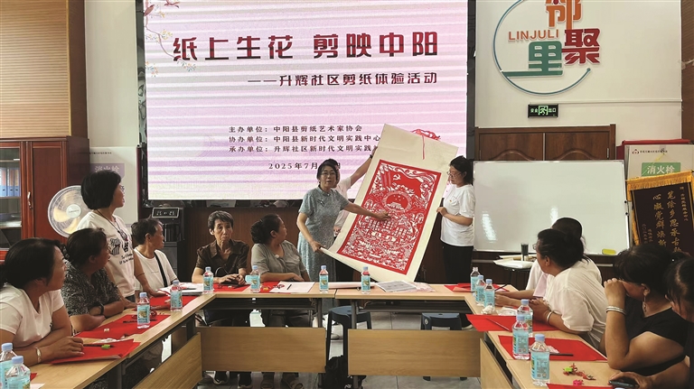 2025年7月25日,由中陽縣剪紙藝術家協(xié)會主辦、升輝社區(qū)文明實踐站承辦的“紙上生花·剪映中陽”非遺體驗活動成功舉辦。30余名居民在崔春梅的指導下,系統(tǒng)學習剪紙的歷史脈絡、藝術特色與實操技藝,創(chuàng)作出多幅生動作品?;顒语@著增強了居民對本土文化的認同與自豪,提升了社區(qū)凝聚力。隨后,鋼城社區(qū)也復制并拓展了這一模式,進一步驗證其在基層推廣中的適應性與實效性。