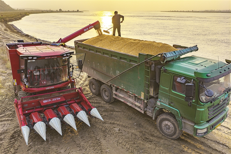 圖②為11月2日,在河南省三門峽市靈寶西閻鄉(xiāng)黃河岸邊,收割機(jī)把搶收的玉米裝車(無人機(jī)照片)。 杜杰 攝
