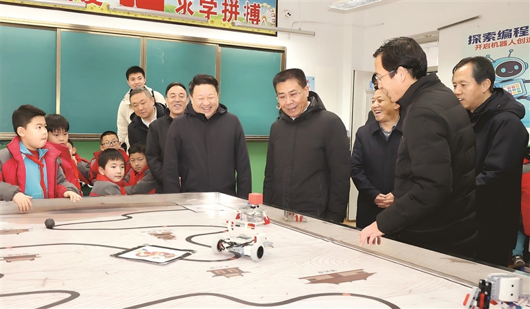 孫大軍深入黃白塔小學(xué)科創(chuàng)空間、創(chuàng)客中心、科學(xué)實(shí)驗(yàn)室、人工智能教室、宿舍、餐廳等場(chǎng)所,詳細(xì)了解科技課程設(shè)置、教學(xué)活動(dòng)開展、師資隊(duì)伍建設(shè)和學(xué)生興趣培養(yǎng)等情況,現(xiàn)場(chǎng)觀看學(xué)生科技作品展示與實(shí)踐活動(dòng),對(duì)該校推動(dòng)學(xué)生全面發(fā)展取得的成績(jī)予以充分肯定。