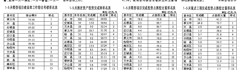 1-5月,全市固定資產(chǎn)投資完成140.1億元,完成全年投資任務(wù)的28%。其中轉(zhuǎn)型項目完成投資78.2億元,占固定資產(chǎn)投資的比重為55.8%;省市重點(diǎn)工程完成投資58.1億元,占固定資產(chǎn)投資的比重為41.5%。現(xiàn)將全市綜合考核排名和主要指標(biāo)完成情況予以通報,各縣(市、區(qū))和市直有關(guān)部門要高度重視,正視工作差距,力克工作難點(diǎn),強(qiáng)化要素保障,努力形成上下協(xié)同、橫向聯(lián)動、齊抓共管的格局,助推高質(zhì)量轉(zhuǎn)型發(fā)展取得新突破,確保全年各項目標(biāo)任務(wù)圓滿完成。 市轉(zhuǎn)型項目辦