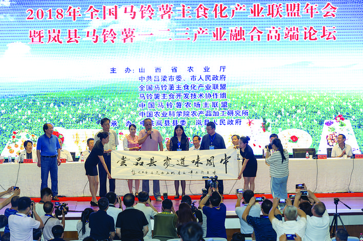 2018年全國馬鈴薯主食化產(chǎn)業(yè)聯(lián)盟年會馬鈴薯產(chǎn)品競拍暨嵐縣招商引資推介會。記者 劉亮亮 攝