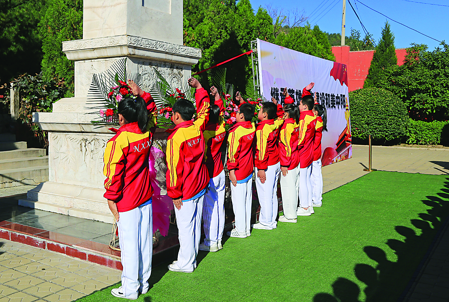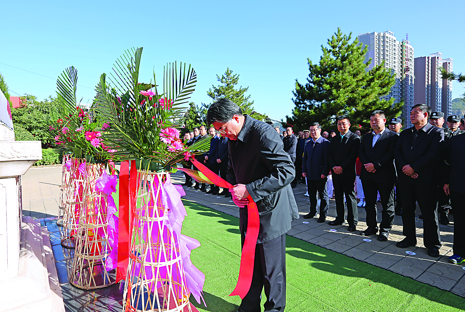 上午9時整,烈士公祭活動正式開始,中華人民共和國國歌響徹全場,全體人員面向紀念碑列隊肅立,向為中國人民解放事業(yè)和共和國建設(shè)事業(yè)英勇獻身的烈士們默哀。默哀完畢,參加活動的少先隊員們齊聲獻唱《我們是共產(chǎn)主義接班人》并敬少先隊隊禮,向革命先烈表達了繼承光榮傳統(tǒng)、當好接班人的遠大志向。伴隨著激昂深情的旋律,少先隊員們托起花籃,緩緩走向烈士紀念碑,將花籃擺放到紀念碑前。喬曉峰神情肅穆,緩步上前,仔細整理花籃上的緞帶。全體參祭人員瞻仰革命烈士紀念碑,深切緬懷革命先烈的豐功偉績,虔誠祭奠革命先烈的不朽英魂,表達對革命先烈的無限敬仰。