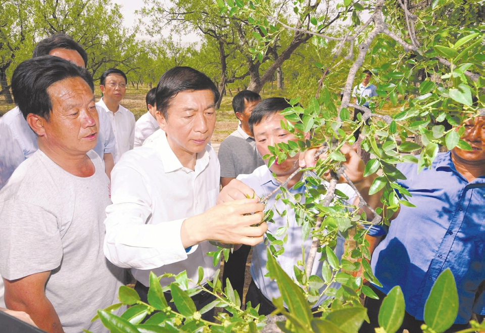 駱惠寧十分關(guān)注省委年初部署的農(nóng)村改革重點(diǎn)任務(wù)的落實(shí)情況。在稷山縣國(guó)家級(jí)板棗園,駱惠寧仔細(xì)了解枝芽修剪、棗林合作社經(jīng)營(yíng)、深化農(nóng)業(yè)科技服務(wù)改革等情況。他指出,要完善合作社經(jīng)營(yíng)機(jī)制,推進(jìn)農(nóng)業(yè)科技人員收入分配制度改革。正在勞作的棗農(nóng)紛紛趕了過(guò)來(lái),駱惠寧與大家熱情交談,勉勵(lì)他們不斷優(yōu)化品種、改進(jìn)技術(shù)、提高產(chǎn)量、創(chuàng)出品牌,獲得更多收益。在臨猗縣孫吉鎮(zhèn)薛公村,駱惠寧了解荒溝治理、荒灘開(kāi)發(fā)和土地流轉(zhuǎn)模式,勉勵(lì)大家要通過(guò)持續(xù)深化農(nóng)村土地制度改革,把黃河灘涂資源優(yōu)勢(shì)轉(zhuǎn)化為發(fā)展優(yōu)勢(shì),統(tǒng)籌科學(xué)規(guī)劃,打造特色水產(chǎn)品牌。