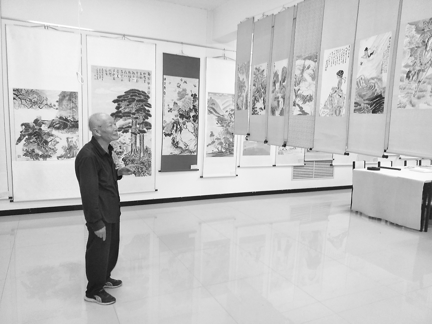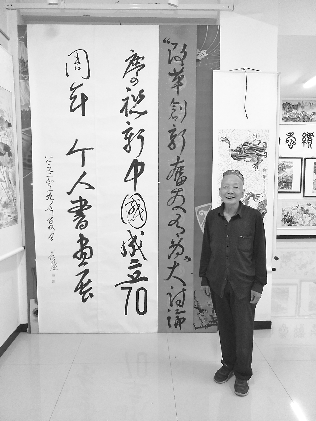 8月14日上午,方山圖書館五樓?,F(xiàn)年77歲的薛秀德先生一如20年前初識(shí)他時(shí)的率真,他的紀(jì)念新中國(guó)成立70周年畫展在這里舉行,只是六層的展廳因屋頂漏水已撤展,只剩五層,就是這一層的作品還是讓我心靈受到強(qiáng)烈震撼!一位年近八旬的老翁,到底是什么樣的精神力量成就了如此規(guī)模的畫展?又是什么力量催促,造就這樣一位將畢生精力奉獻(xiàn)于藝術(shù)的前輩?