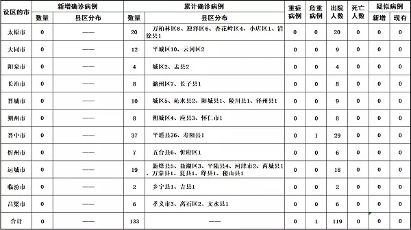 截至3月2日24時,山西省11個市累計報告新型冠狀病毒感染的肺炎確診病例133例。其中: