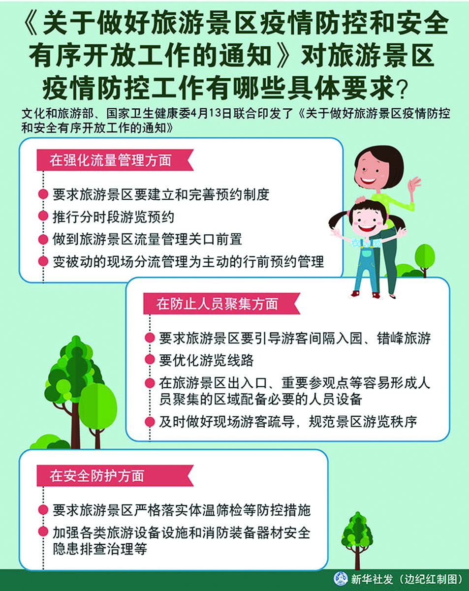 近日,一些旅游景區(qū)在恢復(fù)開放期間出現(xiàn)大量游客聚集擁擠現(xiàn)象,增加了疫情傳播風(fēng)險,為嚴(yán)格規(guī)范解禁后旅游景區(qū)管理,確保旅游景區(qū)安全有序開放,經(jīng)國務(wù)院應(yīng)對新型冠狀病毒感染肺炎疫情聯(lián)防聯(lián)控機制同意,文化和旅游部、國家衛(wèi)生健康委4月13日聯(lián)合印發(fā)《關(guān)于做好旅游景區(qū)疫情防控和安全有序開放工作的通知》(以下簡稱《通知》)。
