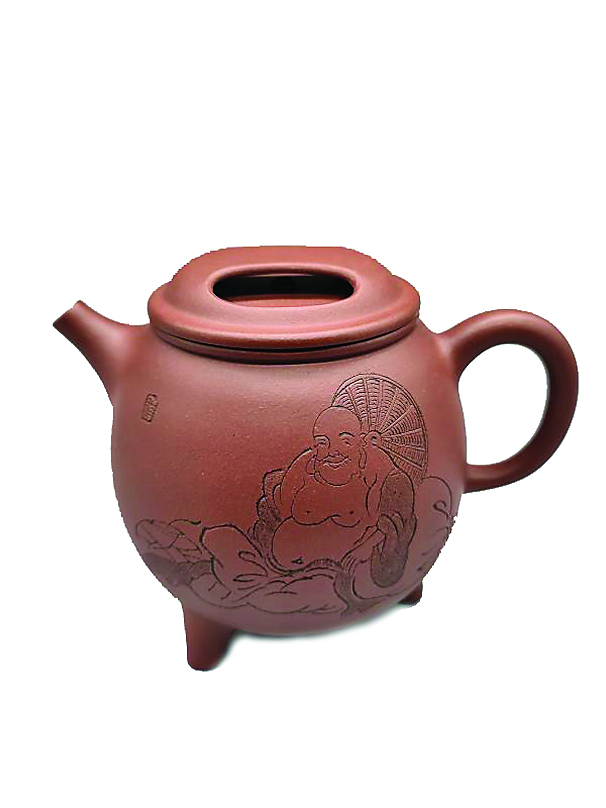 佛教自東晉傳入我國,佛教文化對我們的哲學(xué)、文學(xué)、藝術(shù)及民間風(fēng)俗產(chǎn)生了深遠的影響。紫砂壺既具有實用的泡茶功能,又兼具觀賞的審美功能,賞用兼?zhèn)?,理趣相融,紫砂藝術(shù)與佛學(xué)文化在本質(zhì)上存在很多相似、相近的地方。宜興紫砂藝人深受佛教文化影響,在紫砂壺的造型上也有取材于佛教法器的造型。明代紫砂巨匠時大彬所創(chuàng)制的《僧帽壺》,壺身六面,耳型壺把,呈鴨嘴式壺嘴,壺肩上有五朵蓮瓣圍成壺冠,正所謂“刻桑門之帽,則蓮葉擎臺”(吳梅鼎《陽羨茗壺賦》)。后經(jīng)歷代藝人不斷傳承改進,僧帽壺已成紫砂的傳統(tǒng)經(jīng)典造型。傳至當(dāng)代,以顧景舟為代表的許多大師名家依舊不斷制作《僧帽壺》,還有《容天壺》《濟公壺》《心經(jīng)壺》等等佛教題材紫砂壺也頗受人們歡迎,其中蘊含著紫砂藝術(shù)與佛教文化的天然相合之處。